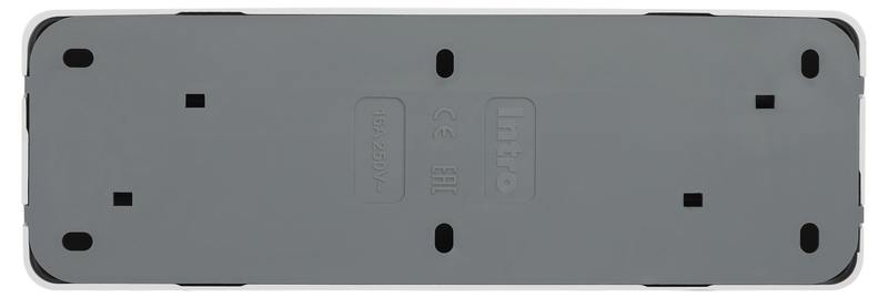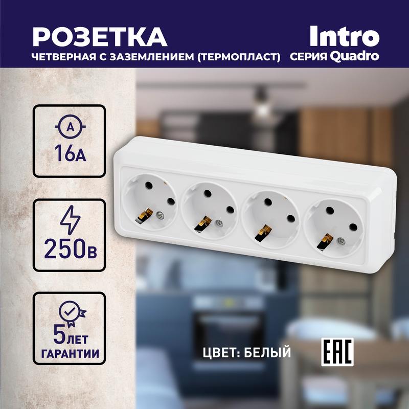 Розетка четырехместная с заземлением 4х2P+E, серии Intro Quadro 2-208-01 открытой установки, цвет белый , 16А-250В, IP20, выполнена из пластика (термопласт), винтовое крепление