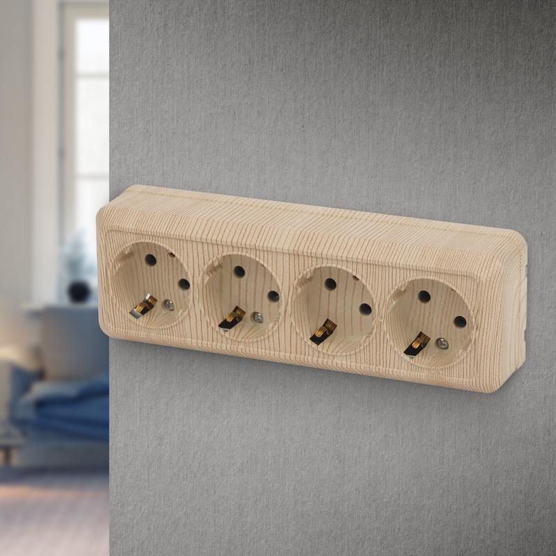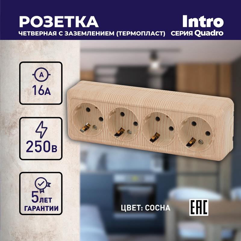 Розетка четырехместная серии Intro Quadro открытой установки цвет сосна 2-208-11. Номинальные характеристики 16А 250В. Выполнена из негорючего термопласта, оснащёна винтовыми зажимами.