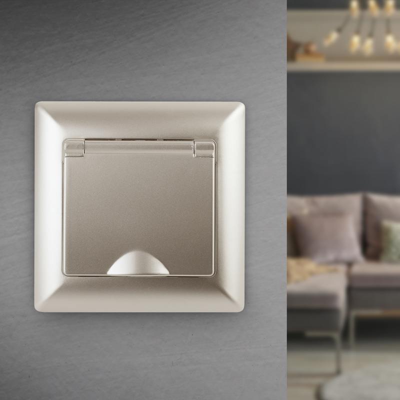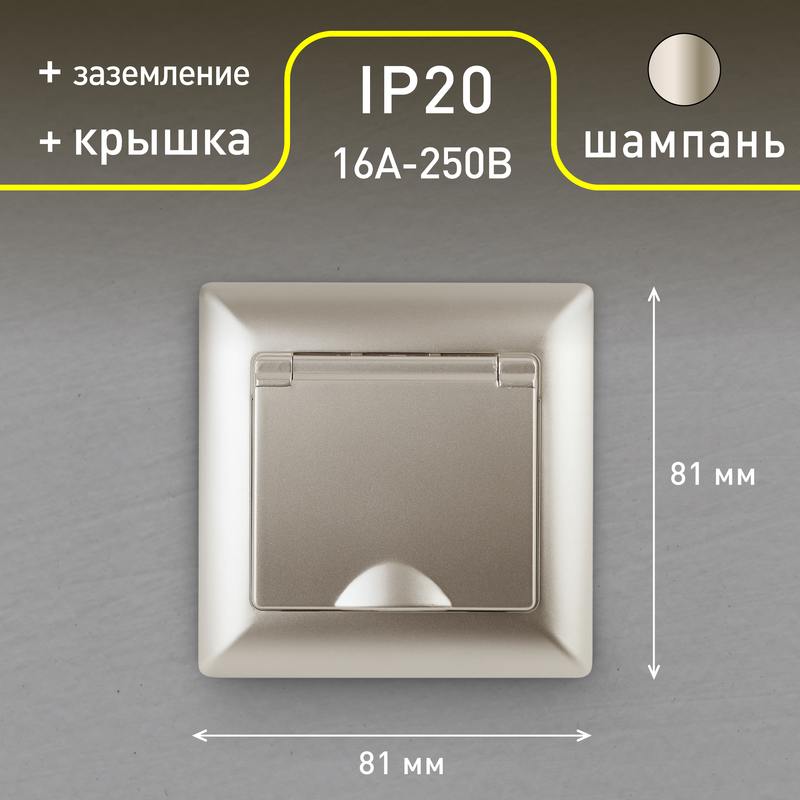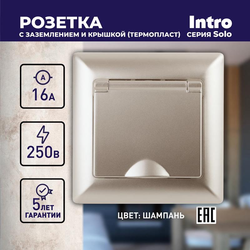 Характеристики Розетка Intro Solo 4-203-04 с заземлением 2P+E Schuko с крышкой, 16А-250В, IP20, СУ, шампань: