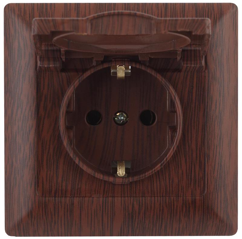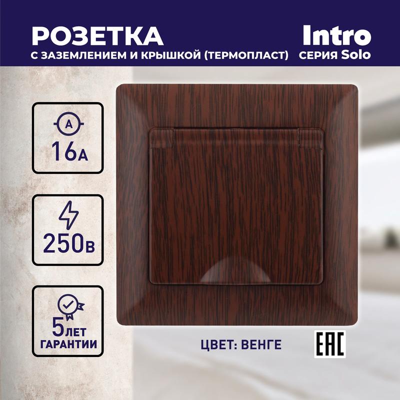 Характеристики Розетка Intro Solo 4-203-10 с заземлением 2P+E Schuko с крышкой, 16А-250В, IP20, СУ, венге:
