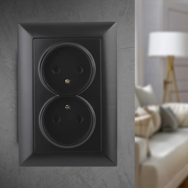 Розетка двойная 2-я серии Intro Solo скрытой установки цвет антрацит 4-204-05. Номинальные характеристики 16А 250В. Розетка выполнена из негорючего термопласта, укомплектована одноместной рамкой, оснащена винтовыми клеммами. Клеммы с двумя отверстиями позволяют соединять соседние розетки шлейфом. Установка в подрозетник производится как на монтажные лапки, так и на винты.