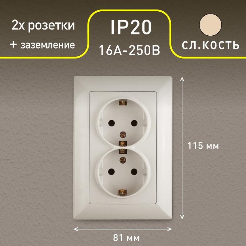 Характеристики Розетка Intro Solo 4-205-02 с заземлением двойная 2X2P+E Schuko, 16А-250В, IP20, СУ, слоновая кость: