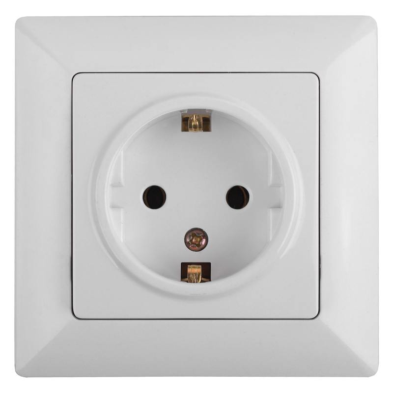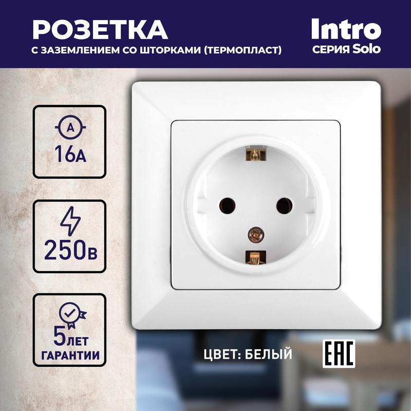 Характеристики Розетка Intro Solo 4-206-01 с заземлением 2P+E Schuko со шторками, 16А-250В, IP20, СУ, белый: