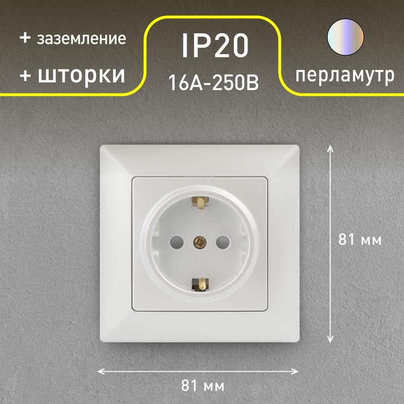 Характеристики Розетка Intro Solo 4-206-06 с заземлением 2P+E Schuko со шторками, 16А-250В, IP20, СУ, перламутр: