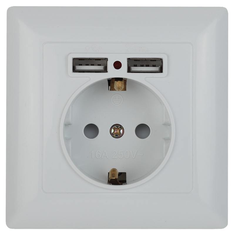 Характеристики Розетка Intro Solo 4-410-01 с заземлением P+E Schuko со шторками, 16А-250В + 2хUSB, IP20, СУ, белый: