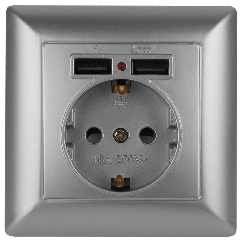 Характеристики Розетка Intro Solo 4-410-03 с заземлением P+E Schuko со шторками, 16А-250В + 2хUSB, IP20, СУ, алюминий: