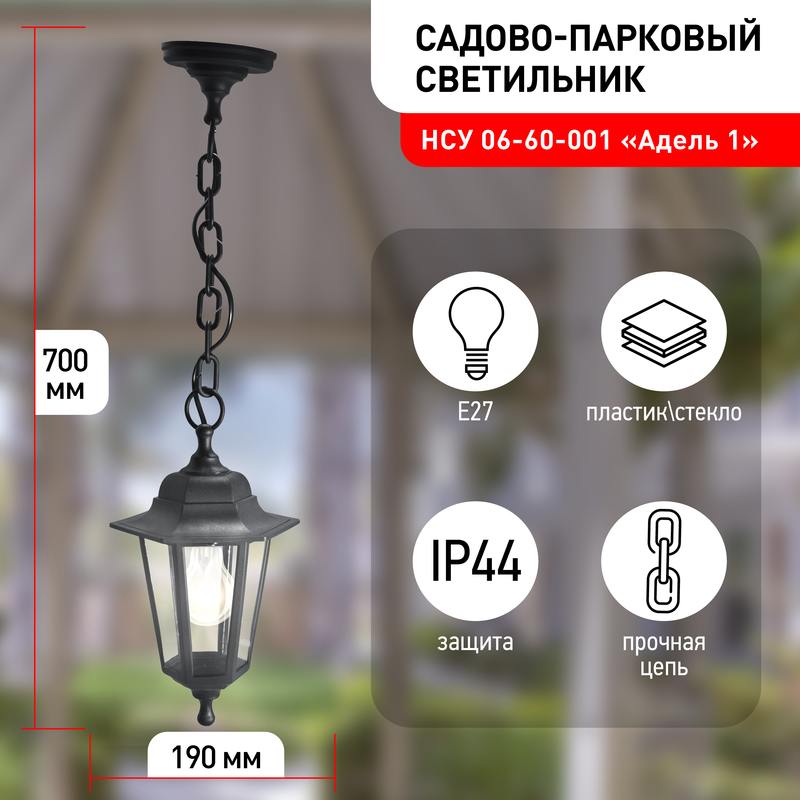 Характеристики Садово-парковый светильник ЭРА НСУ 06-60-001 черный 6 гранный подвесной IP44 Е27 max60Вт: