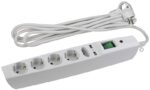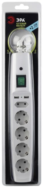 Сетевой фильтр ЭРА SFU-5es-2m-W незаменимый атрибут жителя современного мегаполиса. Фильтр объединяет несколько функций, что особенно удобно в квартире. Сетевой фильтр используется как удлинитель (длина провода составляет 2м). Сетевой фильтр имеет 5 розеток: 4 стандартных гнезда и одно для зарядных устройств. На корпусе также расположены 2 USB-порта напряжением 2.1 А, что дает возможность быстрой зарядки мобильных устройств. Сетевой фильтр имеет надежную защиту, заземление и выключатель. Устройство предохраняет от перегрузки сети, короткого замыкания, импульсных и высокочастотных помех. Для дополнительного удобства на вилке расположено кольцо, позволяющее легко выдернуть удлинитель из розетки. Современный дизайн сетевого фильтра будет выгодно смотреться практически в любом интерьере. Сетевые фильтры ЭРА разрабатывается собственным техническим бюро, проходит проверку на всех этапах производства, что обеспечивает высокое качество продукта.