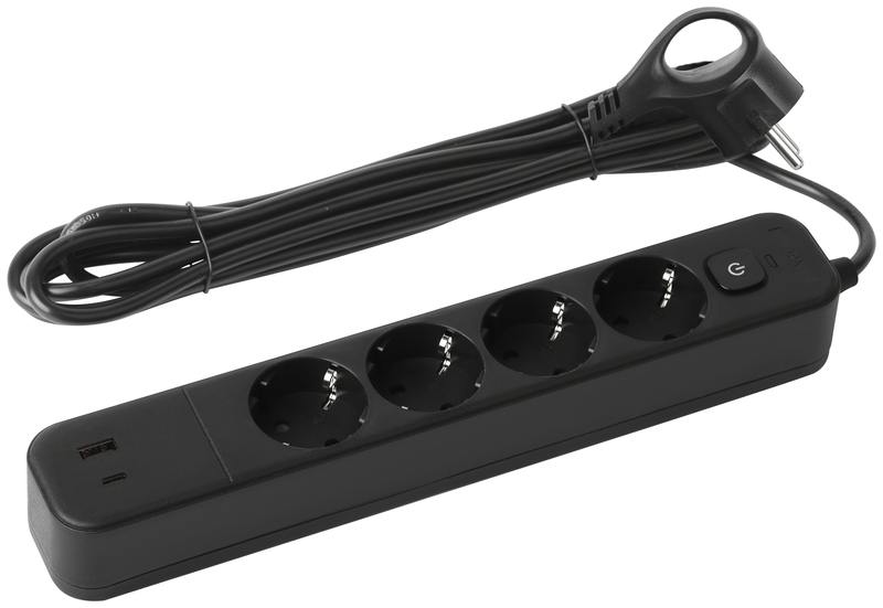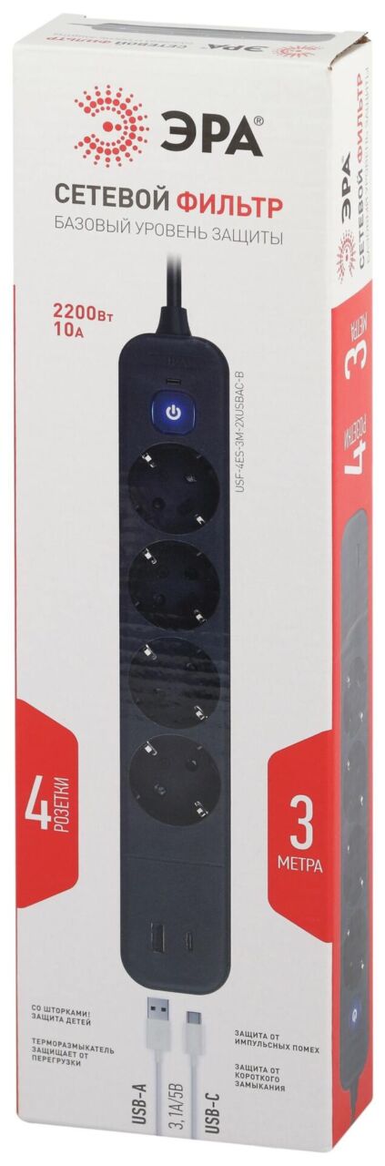 Характеристики Сетевой фильтр ЭРА USF-4es-3m-2xUSBAC-B с базовой защитой с заземлением с выключателем 4 розетки+2xUSBA+C 3,1A 3м 10А: