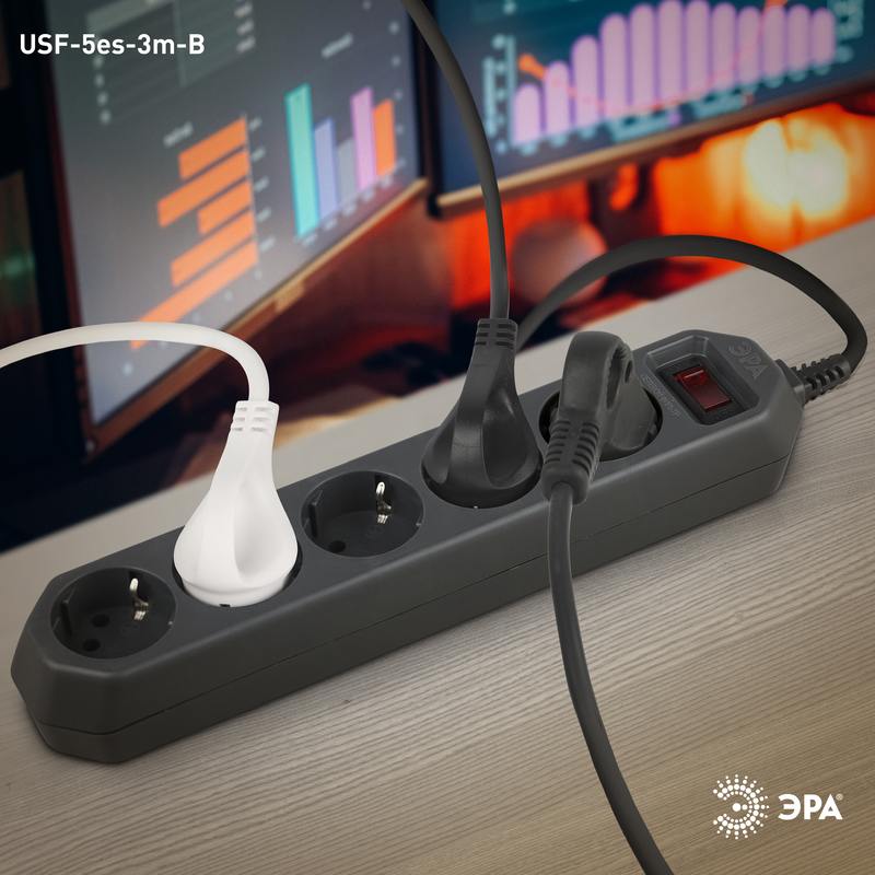 Характеристики Сетевой фильтр ЭРА USF-5es-3m-B с базовой защитой с заземлением с выключателем 5 розеток 3м 10А черный: