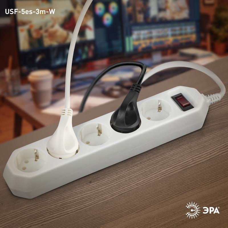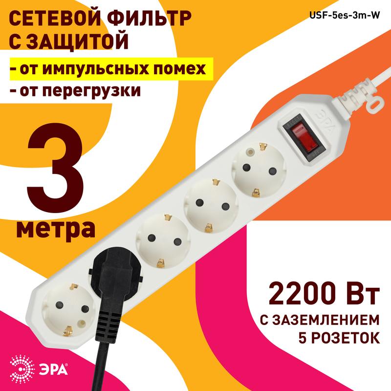 Характеристики Сетевой фильтр ЭРА USF-5es-3m-W с базовой защитой с заземлением с выключателем 5 розеток 3м 10А белый: