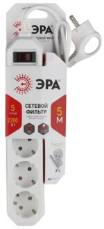 Характеристики Сетевой фильтр ЭРА USF-5es-5m-W с базовой защитой с заземлением с выключателем 5 розеток 5м 10А белый: