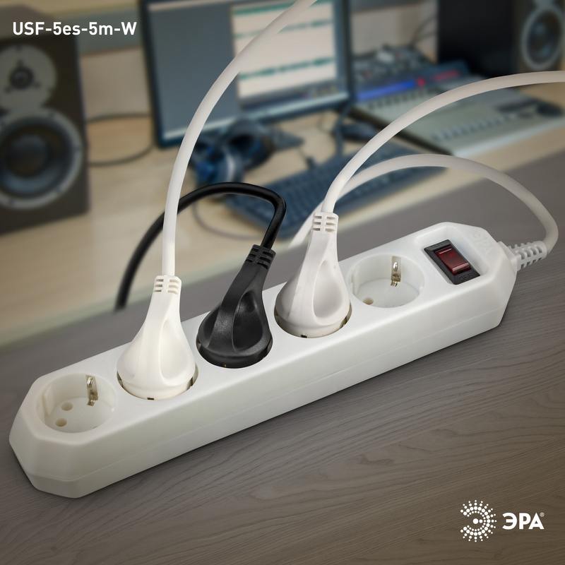 Характеристики Сетевой фильтр ЭРА USF-5es-5m-W с базовой защитой с заземлением с выключателем 5 розеток 5м 10А белый: