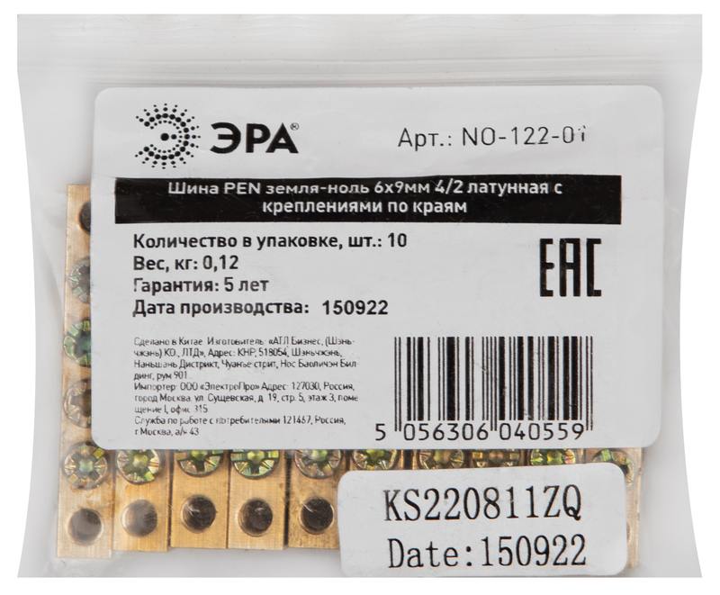Характеристики Шина ЭРА NO-122-01 PEN земля-ноль 6х9мм 4/2 латунная с креплениями по краям: