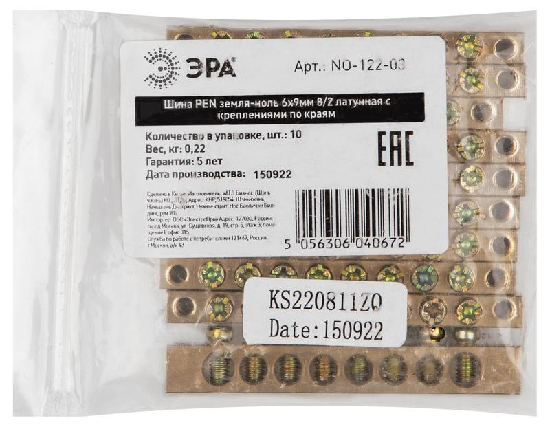 Характеристики Шина ЭРА NO-122-03 PEN земля-ноль 6х9мм 8/2 латунная с креплениями по краям: