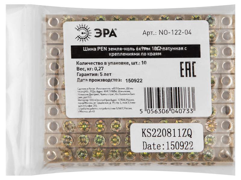 Характеристики Шина ЭРА NO-122-04 PEN земля-ноль 6х9мм 10/2 латунная с креплениями по краям: