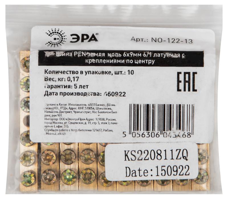 Характеристики Шина ЭРА NO-122-13 PEN земля-ноль 6х9мм 6/1 латунная с креплениями по центру: