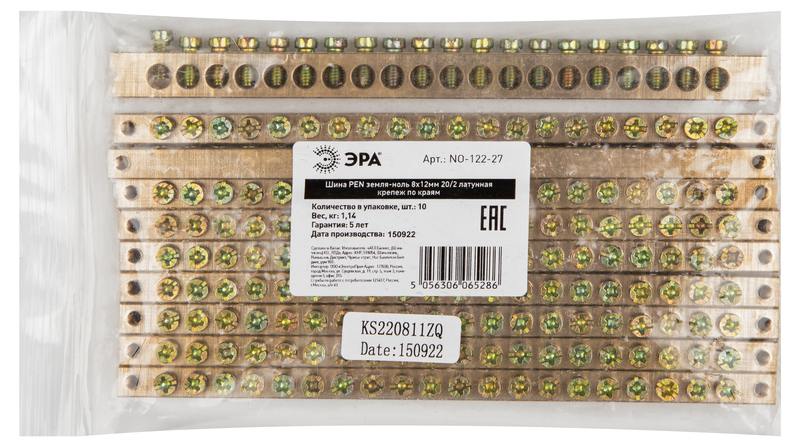 Характеристики Шина ЭРА NO-122-27 PEN земля-ноль 8х12мм 20/2 латунная крепеж по краям: