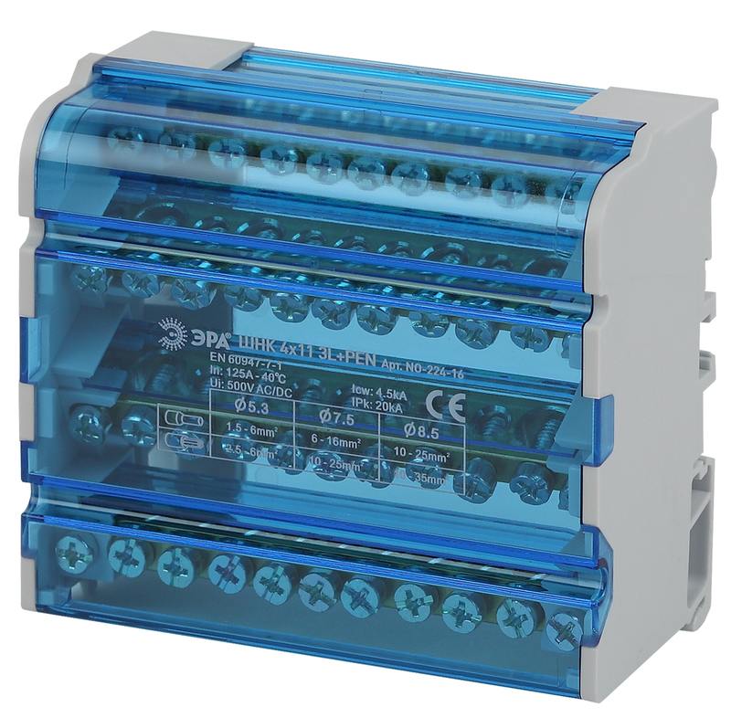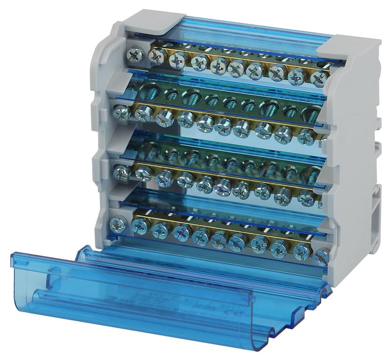 Шины выполнены из высококачественной латуни, изолирующая задняя панель и прозрачная защитная крышка выполнены из самозатухающего пластика. Применяются при комплектации щитового оборудования для подсоединения нулевого провода, провода заземления и фазных проводников. Способы установки: — на монтажную DIN-рейку 35 мм; — на панель щита двумя винтами;