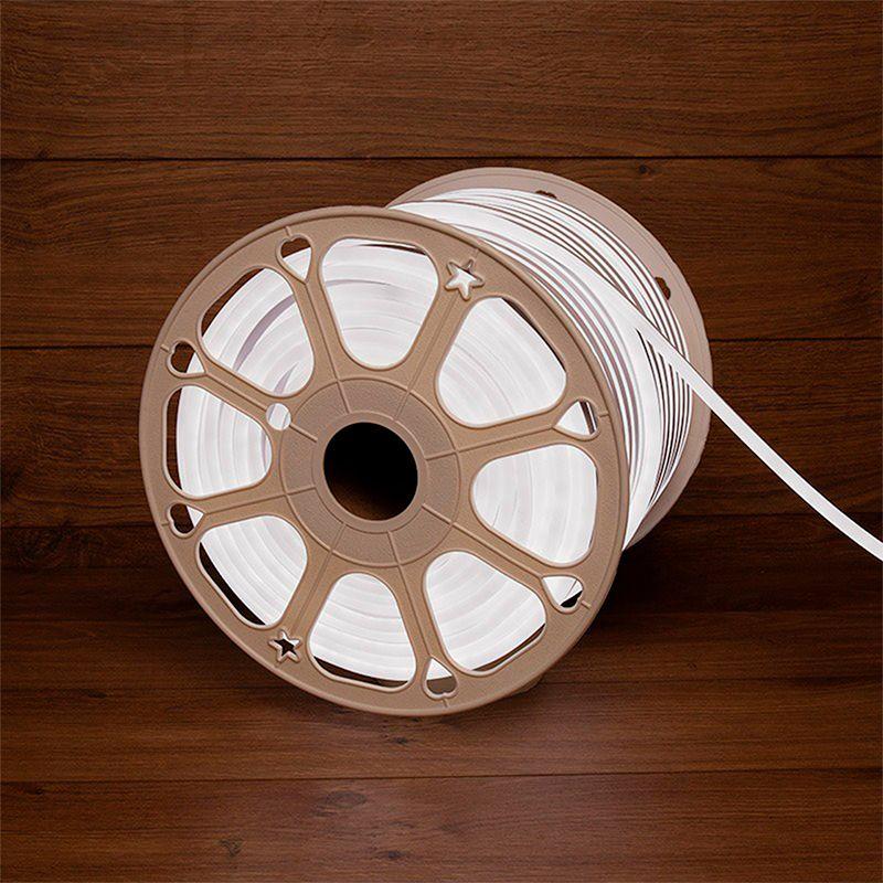 Гибкий неон — световой шнур выполненный из матовой белой ПВХ трубки с токопроводящими жилами и светодиодами внутри. Используется для декоративной и архитектурной подсветки объектов, так же широко распространён в украшении интерьера. Шнур имеет два токопроводящих провода внутри и используется в режиме постоянного свечения. Белый гибкий неон 230В поставляется в бухтах длиной 100 м, имеет модуль резки 1 метр, следуя несложной инструкции легко можно отрезать и подключить гибкий неон нужной длины. Каждая бухта уже укомплектована комплектом подключения, максимальная подключаемая на 1 шнур длина 100 м. Дополнительные шнуры можно приобрести отдельно. При подключении гибкого неона к соединительному разъему (муфте) необходимо заизолировать свободное воздушное пространство соединительного разъема (муфты) морозостойким силиконовым герметиком, предотвращающим попадание влаги. Сверху данного соединения необходимо использовать термоусаживаемую трубку.