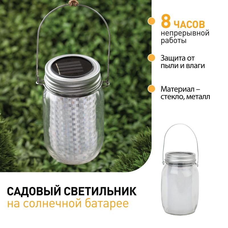 Садовый светильник SL-GL14-JAR-2 станет эффектным украшением Вашей дачной территории. Необычная баночка будет прекрасно смотреться среди цветов, изящно подсветит кустарники или вход в дом. Модель имеет небольшую высоту в 13,5 см и легко вставляется в землю. Садовый светильник функционирует на солнечной батарее. Современный тип получения энергии является экологичным, энергоемким, а также бесшумным. Питание происходит во включенном режиме, днем. После захода солнца в маленькой баночке начинается волшебство. Внутри разными цветами переливаются "звезды". Свет светодиодов преломляется декоративной сеткой, создавая эффект меняющих цвет ярких небесных тел. Для удобства переноски или игр в саду предусмотрена ручка. Работа от солнечной батареи рассчитана 8 часов. Высокая степень защиты от пыли и влаги позволяет оставлять светильник на улице даже во время дождя. Обращаем Ваше внимание, что перед использованием фигурки её необходимо включить и зарядить. Светильник заряжается в течение всего светового дня. Декоративный светильник баночка от компании ЭРА чудесный вариант для украшения Вашего участка.