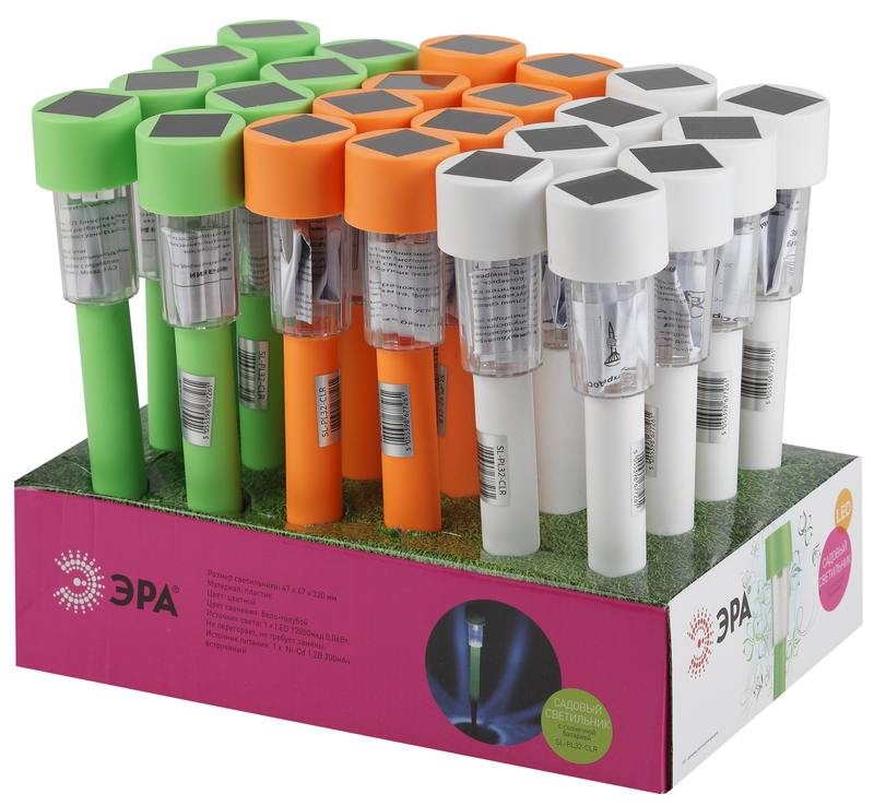 ЭРА SL-PL30-CLR (арт. Б0032593) — бюджетная модель садового светильника классической формы. Этот светильник уличный надёжно защищён от влаги и пыли — IP54. Выполнен из прочного пластика. Светильник садовый устанавливается прямо в грунт и помогает быстро и просто создать красивый ландшафтный дизайн на загородном участке. Нейтральное белое свечение активируется автоматически, как только наступают сумерки. Солнечная панель расположена на верхушке светильника и отлично накапливает энергию. Высота светодиодного светильника для сада на солнечной батарее — 32 см. В промоупаковке 24 светильника в трёх цветах: насыщенный зелёный, оранжевый, белый. Цвета подобраны так, чтобы LED-светильник был хорошо заметен днём в земле, на траве или на садовой дорожке.