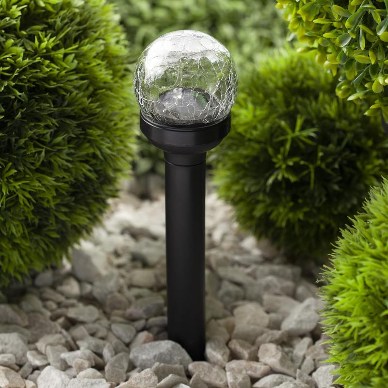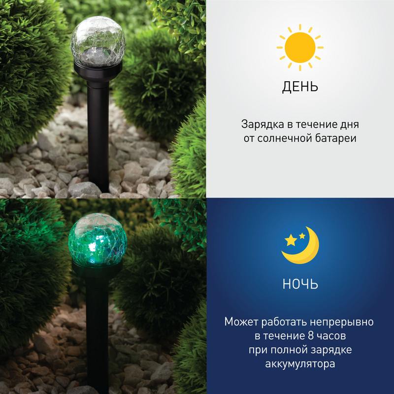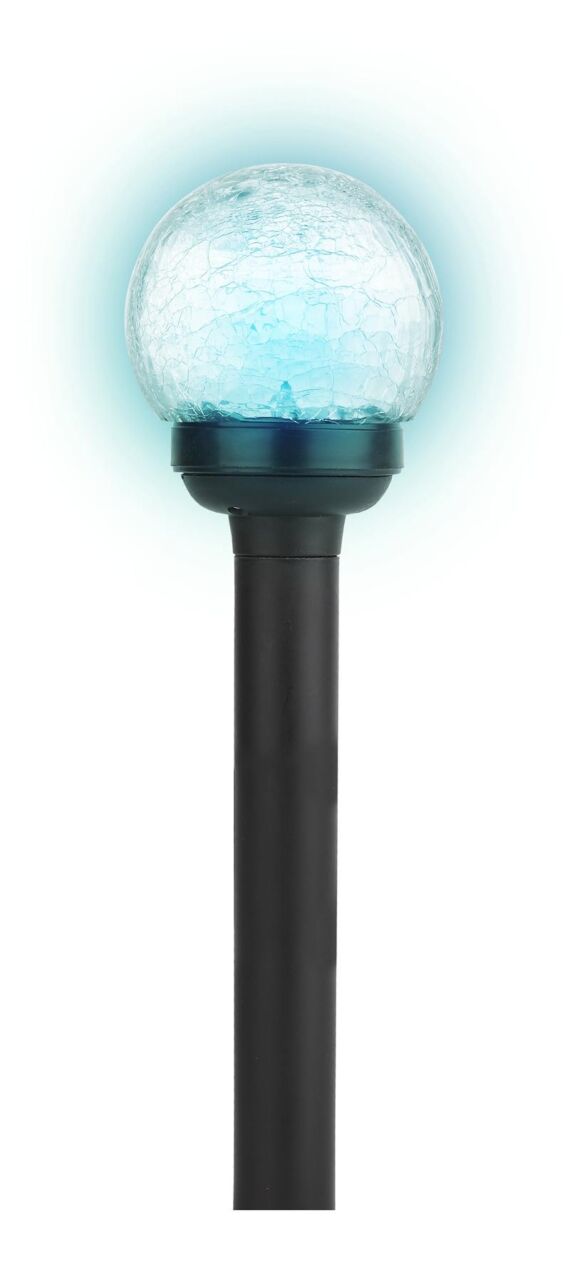Светильник-втыкашка Кракле, в ПРОМОБОКСЕ. Диаметр стеклянного шарика 5,5 см. Основание — пластик. RGB светодиод. Поставляется в промоупаковке по 12 шт. Обращаем Ваше внимание, что перед использованием фигурки её необходимо включить и зарядить. Светильник заряжается в течение всего светового дня.
