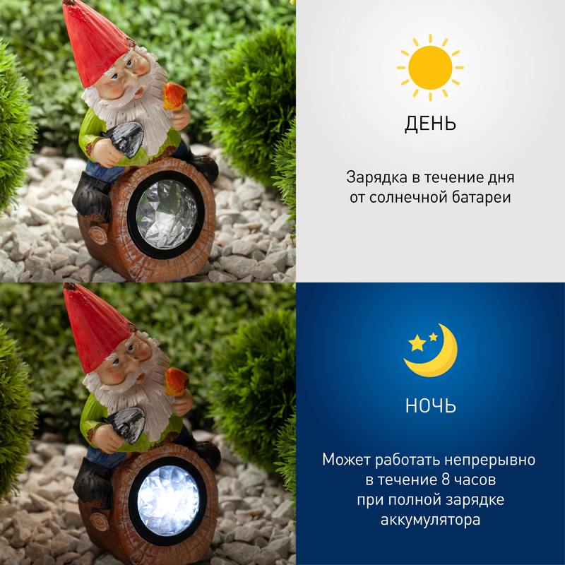 Садово-парковый светодиодный светильник станет самым необычным предметом декора в вашем саду. Небольшие внешние размеры позволят Вам разместить фигурку в палисаднике, украсить пруд около бассейна, изящно подсветить аллею или вход в террасу. Фигурка из полистоуна высотой с легкостью устанавливается в землю. LED светильник функционирует на солнечной батарее. Такой вид получения энергии является максимально экологичным, энергоемким, а также бесшумным. Питание происходит во включенном режиме, днем. С наступлением темноты фигурка «просыпается». На участке создается волшебная атмосфера. Солнечная батарея подарит Вам 8 часов непрерывного освещения. Высокая степень пыле и влагозащиты позволяет оставлять светильник на улице даже в дождливую погоду. Обращаем Ваше внимание, что перед использованием фигурки её необходимо включить и зарядить. Светильник заряжается в течение всего светового дня. Украшайте свой любимый участок вместе с беспроводным декоративным светильником от компании ЭРА!