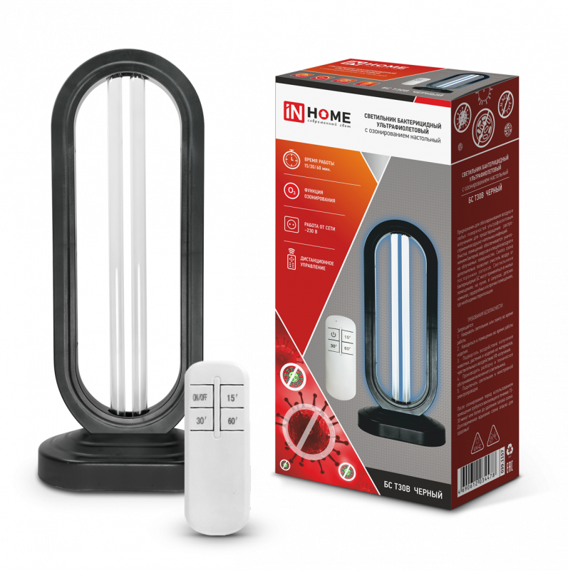 Характеристики Светильник бактерицидный ультрафиолетовый с озонированием настольный БС Т30B 30Вт 230В с пультом ДУ черный IN HOME: