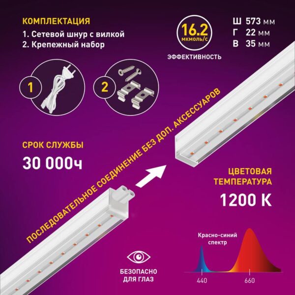 | Преимущества | Линейный светодиодный светильник для выращивания растений; для периода вегетации; 220-240V ; Мощность 9 Вт.; 1,5 мкмоль/Вт*с; фиолетовое свечение |