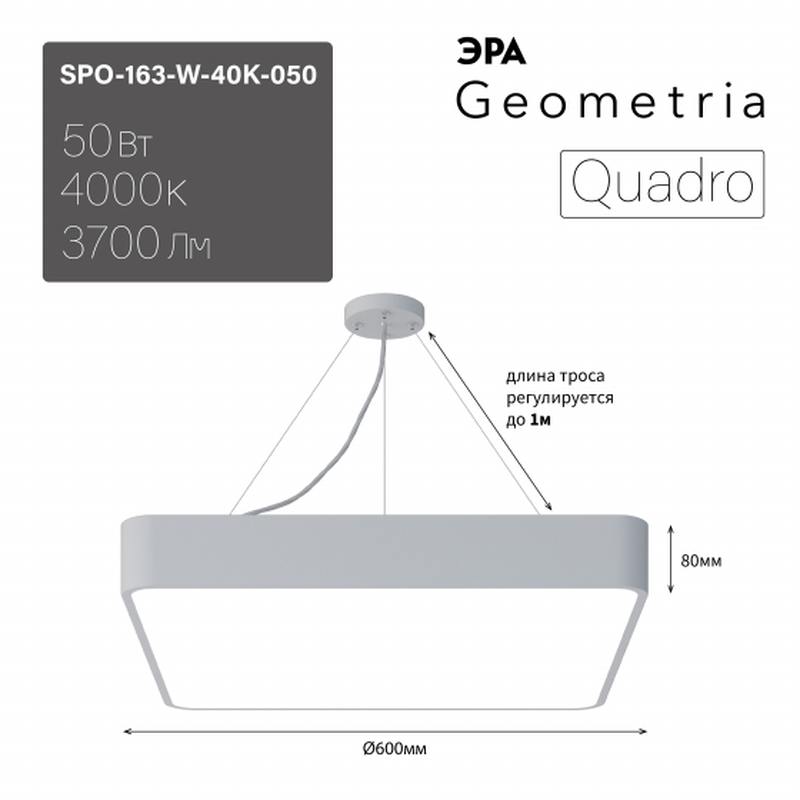 Характеристики Светильник LED ЭРА Geometria SPO-163-W-40K-050 Quadro 50Вт 4000К 3700Лм IP40 600*600*80 белый подвесной драйвер внутри: