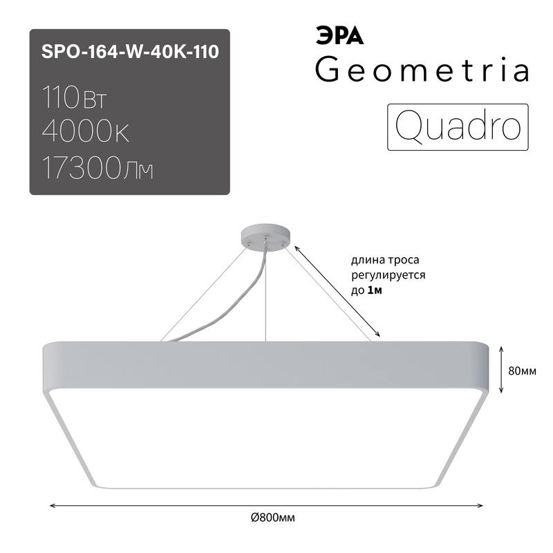 Характеристики Светильник LED ЭРА Geometria SPO-164-W-40K-110 Quadro 110Вт 4000К 17300Лм IP40 800*800*80 белый подвесной: