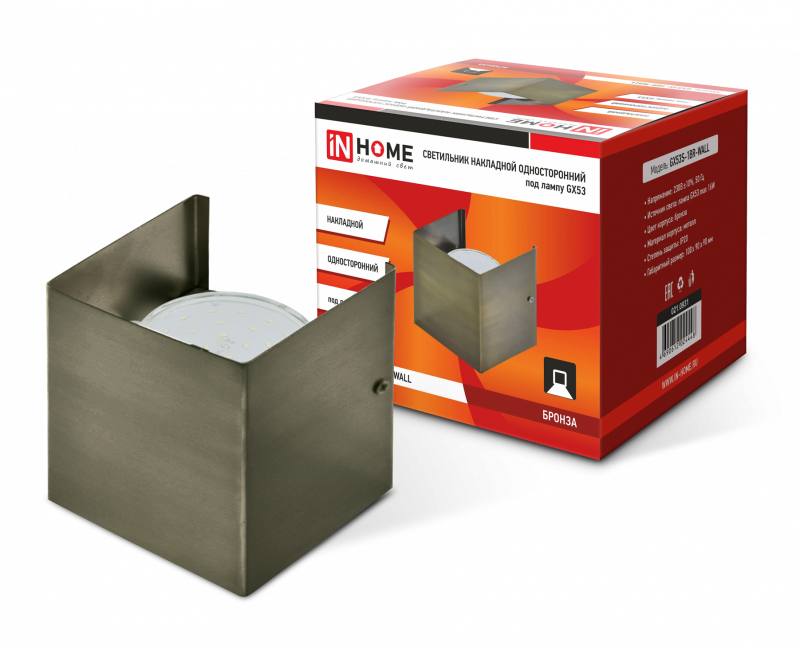 Характеристики Светильник накладной односторонний GX53S-WALL 1BR под лампу GX53 230B бронза IN HOME: