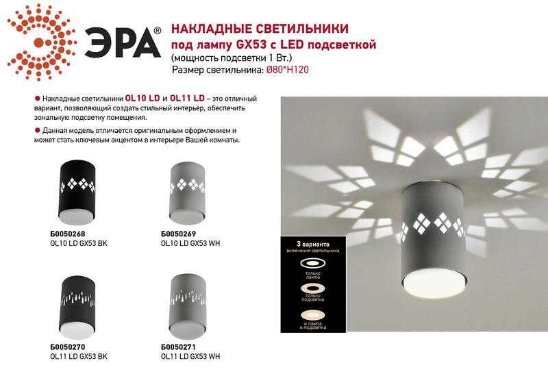 Характеристики Светильник настенно-потолочный спот ЭРА OL11 LD GX53 WH белый, подсветка 1 W: