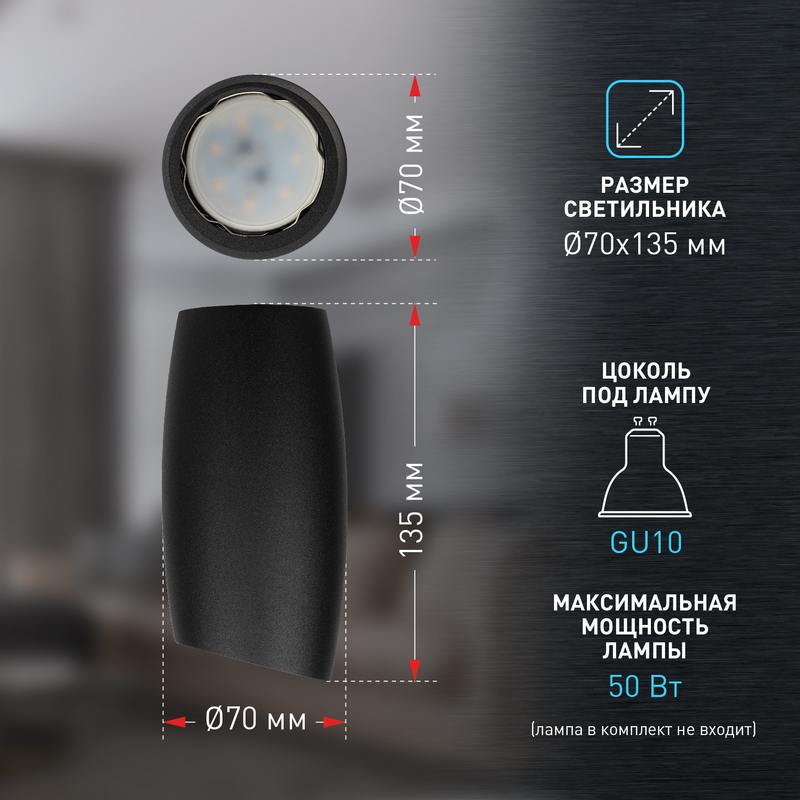Накладной светильник OL20 BK смотрится изящно и легко в любом интерьере. Мягкие изогнутые формы светильника легко комбинировать с мебельной фурнитурой и декором, придавая законченность интерьеру помещения. Цоколь для источника света GU10, напряжение питания ~230В 50/60Гц, материал алюминий, цвет светильника черный, размер D70*H135мм, максимальная мощность лампы 50Вт, степень защиты IP20