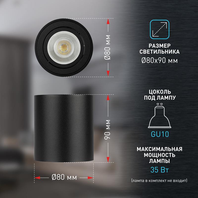 Накладной светильник OL21 BK новый популярный элемент декора в современном помещении. Поворотный механизм позволяет создавать дополнительные световые акценты. Подходит как под галогенную, так и светодиодную лампу. Цоколь для источника света GU10, напряжение питания 220В ~50/60Гц, материал алюминий, цвет светильника черный, размер D80мм*H90мм, максимальная мощность лампы 35Вт, степень защиты IP20