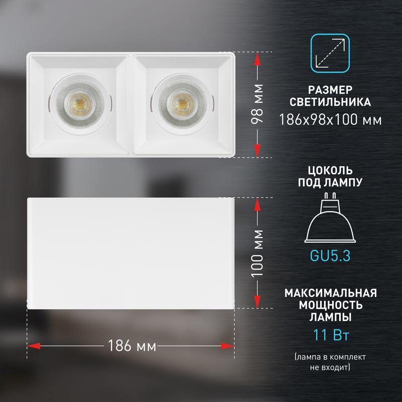 Накладной светильник OL24-2 WH прекрасно дополняет помещение стильным акцентным освещением. Лампа располагается глубоко в светильнике, обеспечивая мягкий неслепящий свет. Максимальное кол-во ламп 2 шт (в комлект не входят). Светильник имеет поворотный механизм. Цоколь для источника света GU5.3, напряжение питания 12В, материал пластик, цвет светильника белый, размер 186*98, максимальная мощность лампы 11Вт, степень защиты IP20