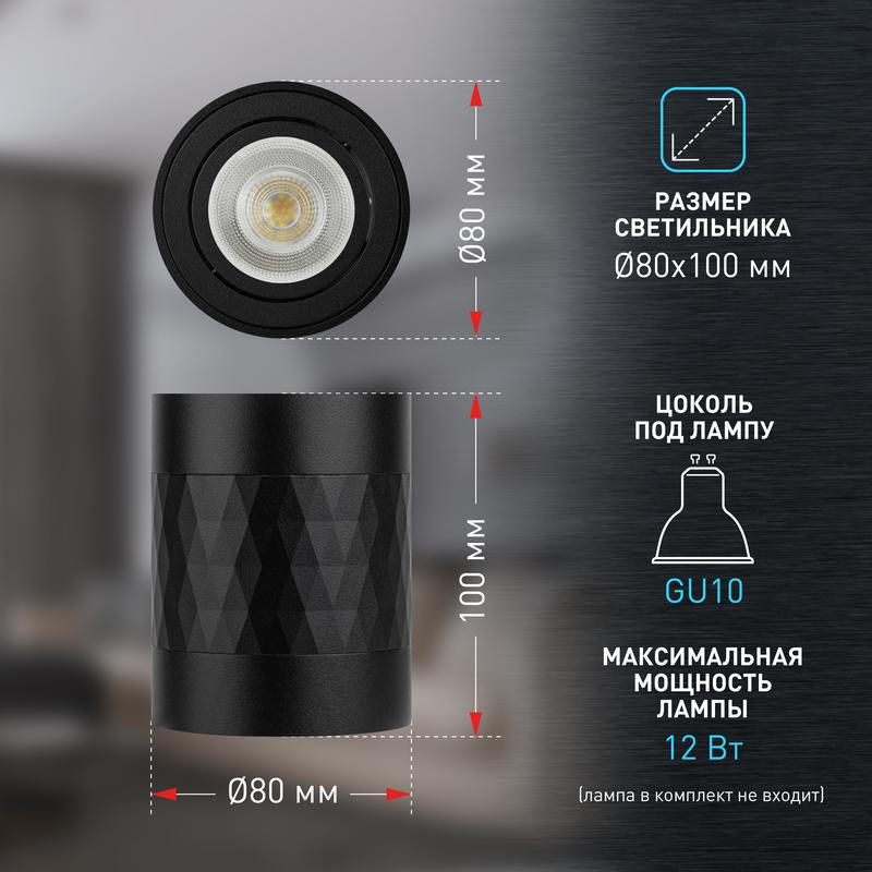 Накладной светильник OL33 BK делает помещение зрительно более стильным и интересным. Благодаря поворотному механизму светильник может создавать дополнительные световые акценты в помещении. Используя по периметру несколько однотипных осветительных устройств, можно сформировать интеренсые световые геометрические рисунки. Цоколь для источника света GU10, напряжение питания ~230В 50/60Гц, материал алюминий, железо, цвет светильника черный, размер D80*H100мм, максимальная мощность лампы 12Вт, степень защиты IP20