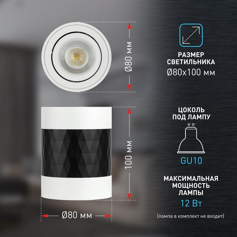 Накладной светильник OL33 WH/BK делает помещение зрительно более стильным и интересным. Благодаря поворотному механизму светильник может создавать дополнительные световые акценты в помещении. Используя по периметру несколько однотипных осветительных устройств, можно сформировать интеренсые световые геометрические рисунки. Цоколь для источника света GU10, напряжение питания ~230В 50/60Гц, материал алюминий, железо, цвет светильника черный, белый, размер D80*H100мм, максимальная мощность лампы 12Вт, степень защиты IP20