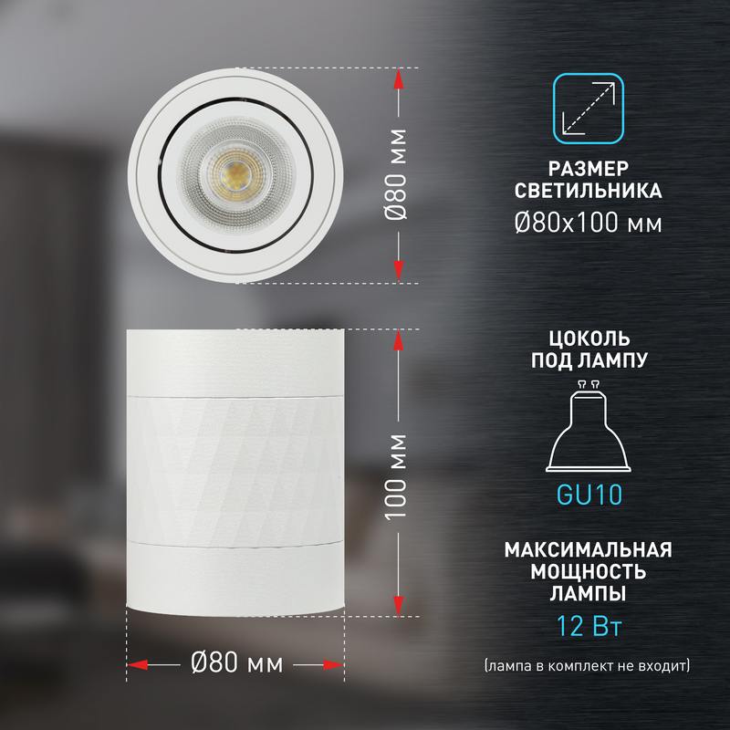 Накладной светильник OL33 WH делает помещение зрительно более стильным и интересным. Благодаря поворотному механизму светильник может создавать дополнительные световые акценты в помещении. Используя по периметру несколько однотипных осветительных устройств, можно сформировать интеренсые световые геометрические рисунки. Цоколь для источника света GU10, напряжение питания ~230В 50/60Гц, материал алюминий, железо, цвет светильника белый, размер D80*H100мм, максимальная мощность лампы 12Вт, степень защиты IP20