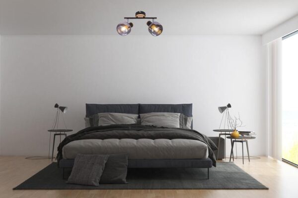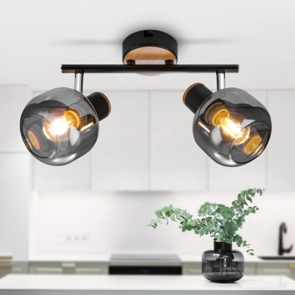 Броский дизайн этих светильников достигается сочетанием контрастных оттенков затемнённых выдувных плафонов и тёмного металлического каркаса с декоративными элементами из светлого дерева. Споты оснащены долговечными поворотными механизмами высокого качества с надёжной фиксацией. Коллекция представлена настенно-потолочным светильником на 2 лампы.