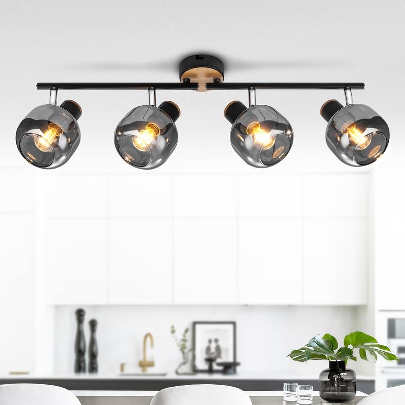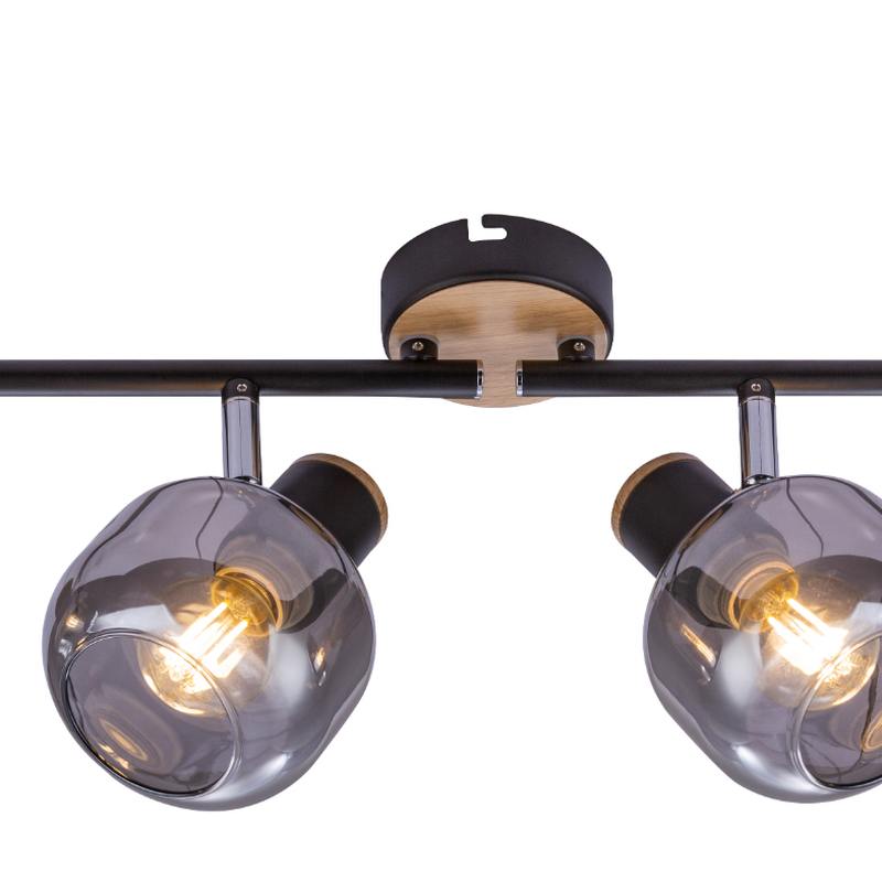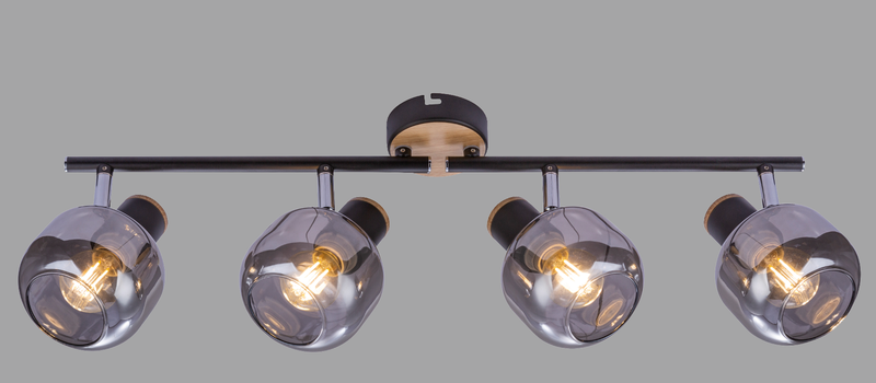Броский дизайн этих светильников достигается сочетанием контрастных оттенков затемнённых выдувных плафонов и тёмного металлического каркаса с декоративными элементами из светлого дерева. Споты оснащены долговечными поворотными механизмами высокого качества с надёжной фиксацией. Коллекция представлена настенно-потолочным светильником на 4 лампы.