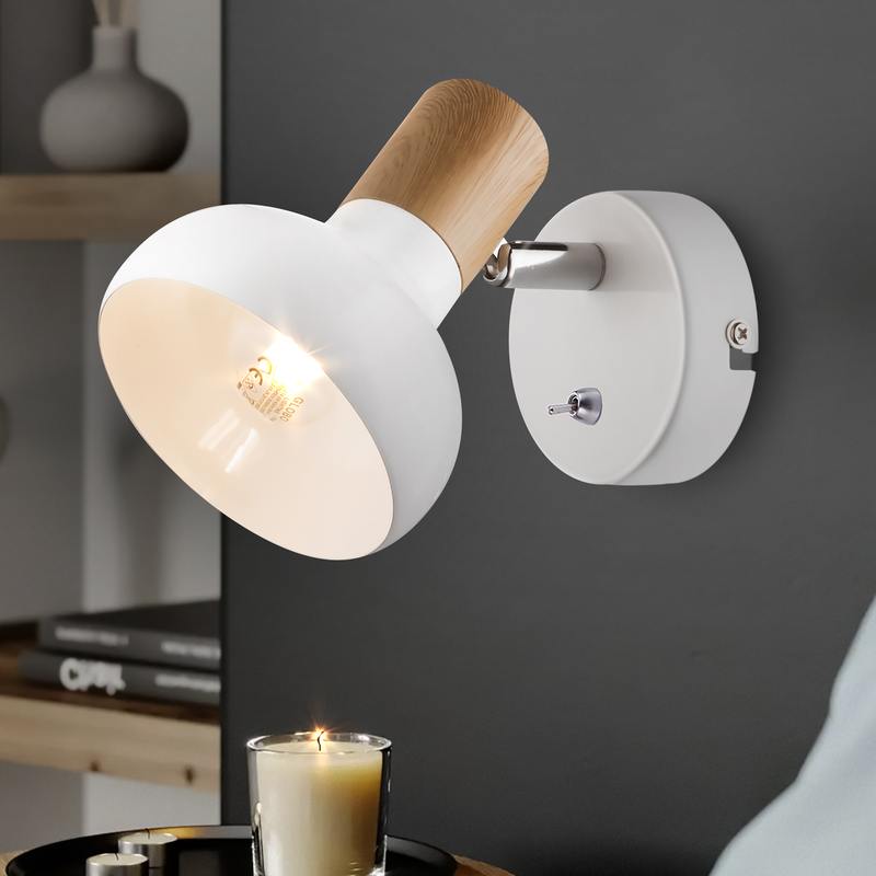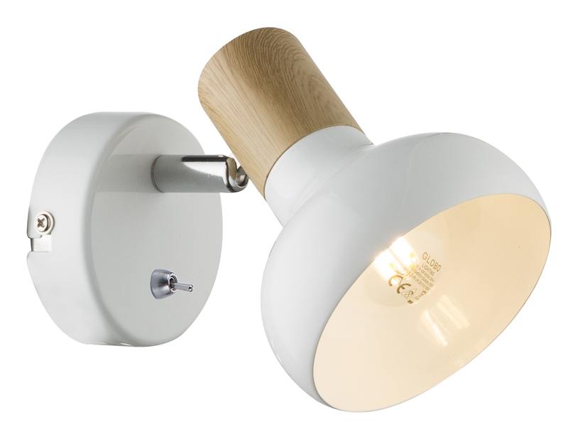 Rivoli Lorena — металлический спот белого матового цвета с отделкой элементов под светлое дерево. Один плафон под лампу Е14 40 Вт. Спот поворотный — вы с удобством и в любой момент сможете регулировать направление освещения. Это преимущество делает данный светильник идеальным вариантом бра над кроватью, бра над столом, бра в спальню, бра в прихожую. Настенно-потолочный спот с выключателем на корпусе. Выключатель и миниатюрный рожок плафона имеют красивое хромированное покрытие.