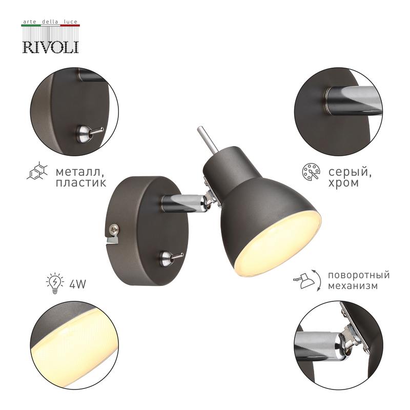 Характеристики Светильник настенно-потолочный спот Rivoli Renata 6158-701 светодиодный GR LED 1х 4 Вт 3200К поворотный с выключателем: