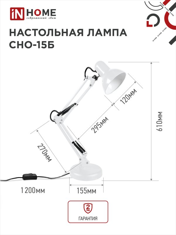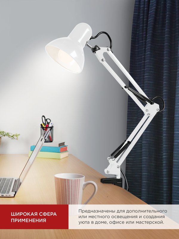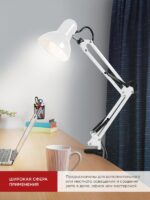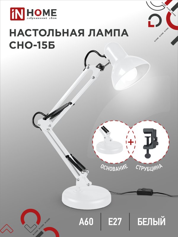 Назначение и применение Светильник настольный под лампу на основании + струбцина СНО 15Б 60Вт E27 230В БЕЛЫЙ IN HOME