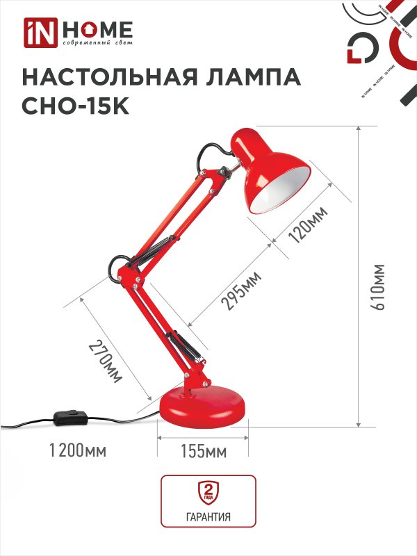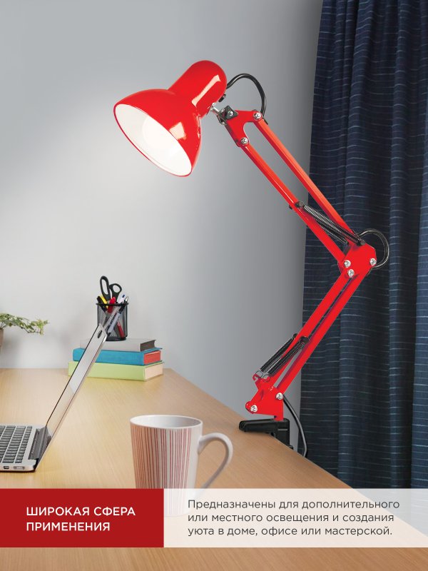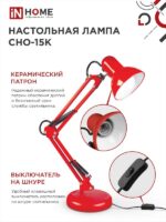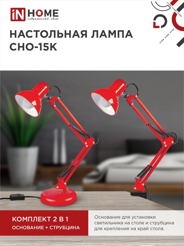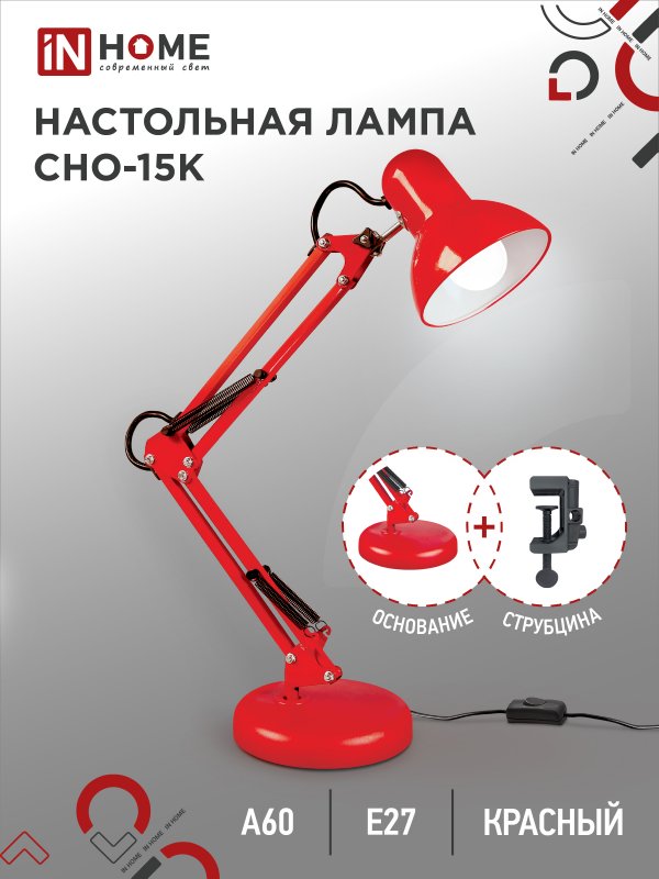Характеристики Светильник настольный под лампу на основании + струбцина СНО 15К 60Вт E27 230В КРАСНЫЙ IN HOME: