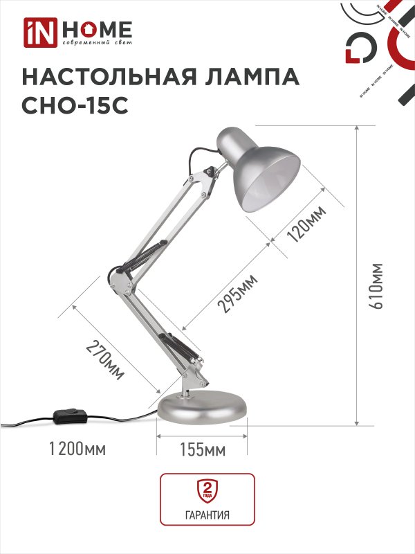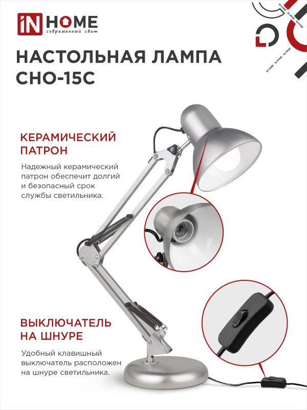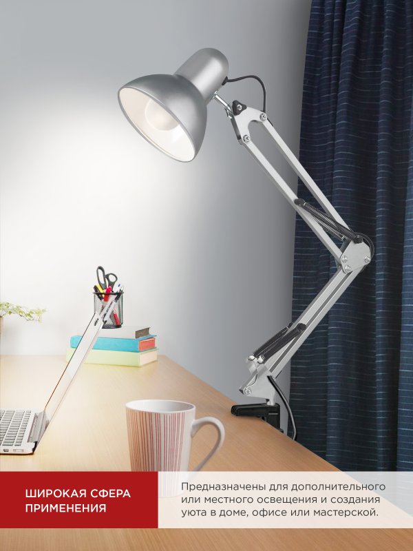 Назначение и применение Светильник настольный под лампу на основании + струбцина СНО 15С 60Вт E27 230В СЕРЕБРО IN HOME