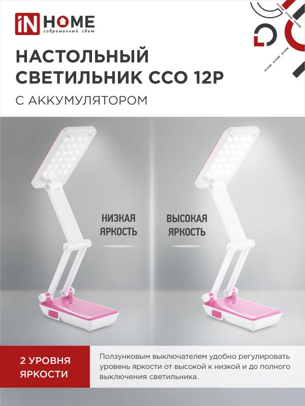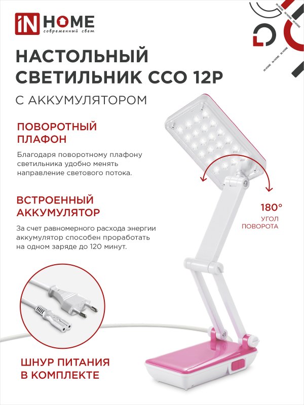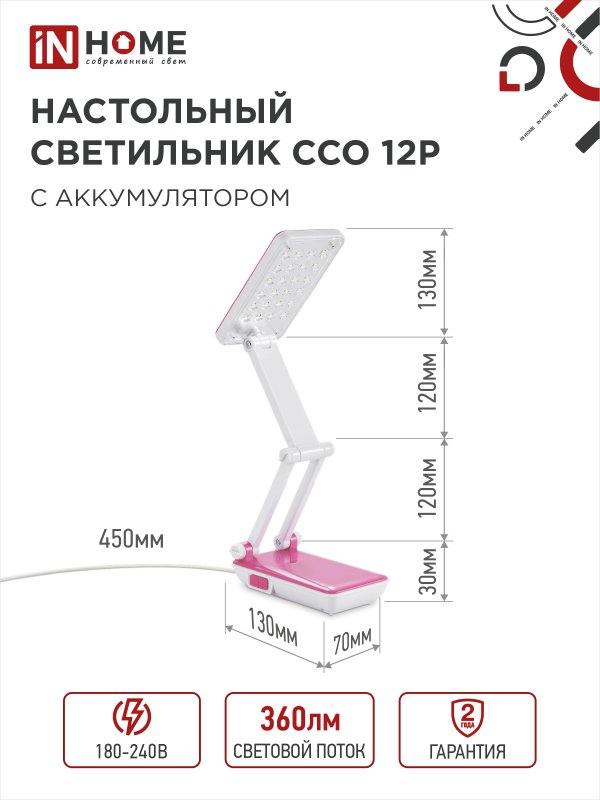 Характеристики Светильник настольный светодиодный аккумуляторный ССО 12Р 6Вт 6500К 360Лм 2 уровня яркости 230В РОЗОВЫЙ IN HOME: