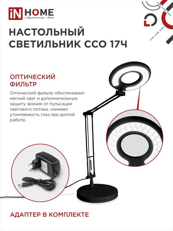 Основное назначение настольного светодиодного светильника ССО 17 ТМ IN HOME – дополнительное освещение рабочего стола. Модель подходит как для дома, так и для офиса. Светильник оснащен оптическим фильтром. Питание светильников ССО-17 осуществляется от бытовой электросети 230В. Адаптер входит в комплект. Светодиодные светильники In Home гарантируют высокую экономичность, экологическую безопасность и комфорт для зрения