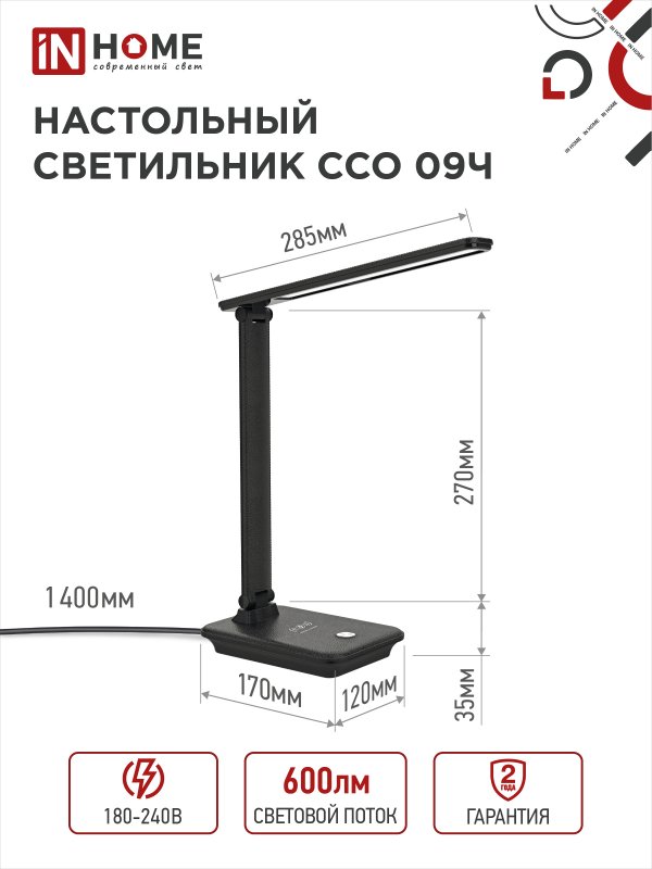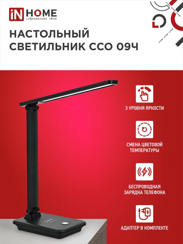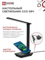 Назначение и применение Светильник настольный светодиодный PLUS ССО-09Ч 12Вт 600Лм сенсор, с беспроводной зарядкой для телефона, адаптер ЧЕРНЫЙ IN HOME